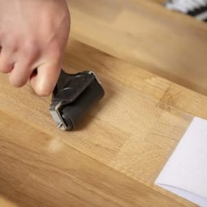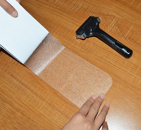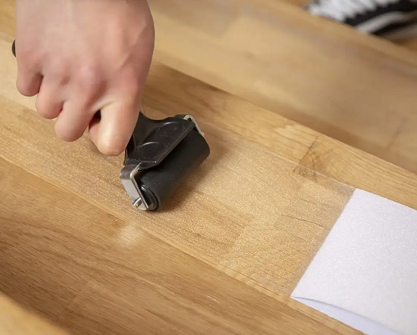 Bước 2: Bóc miếng dán đằng sau và đặt vào các vị trí đã đánh dấu, dán tới đâu dùng con lăn và gạt nhựa lăn tới đó để đẩy bọt khí ra ngoài